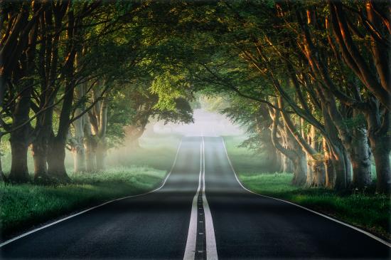 Обои Асфальтированная дорога у зеленых деревьев летом