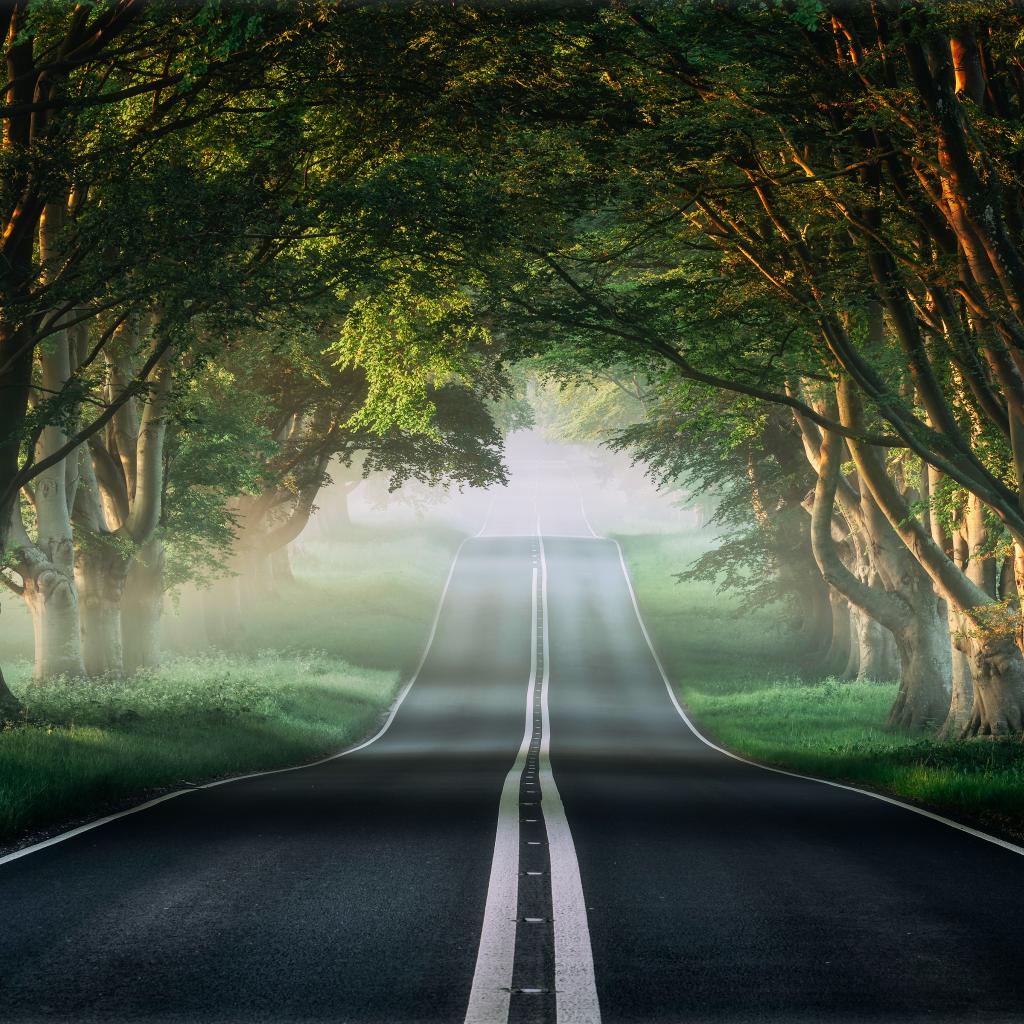 Обои Асфальтированная дорога у зеленых деревьев летом