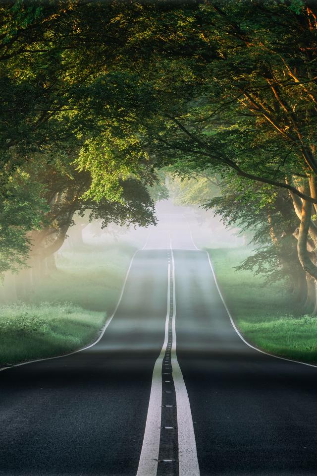 Обои Асфальтированная дорога у зеленых деревьев летом