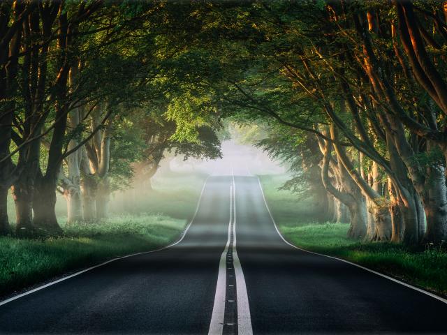 Обои Асфальтированная дорога у зеленых деревьев летом