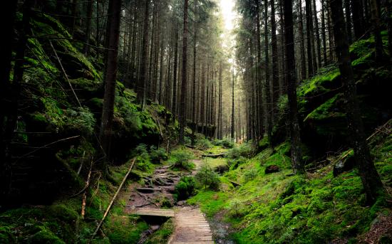 Обои Дорога в покрытом мхом хвойном лесу