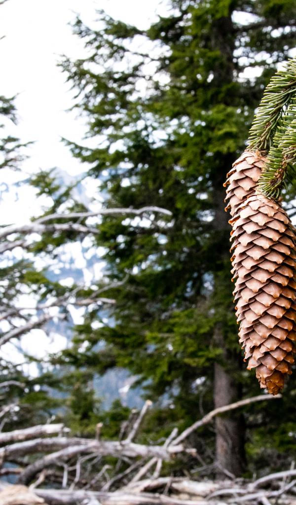 Обои Большие шишки на зеленой ветке ели крупным планом