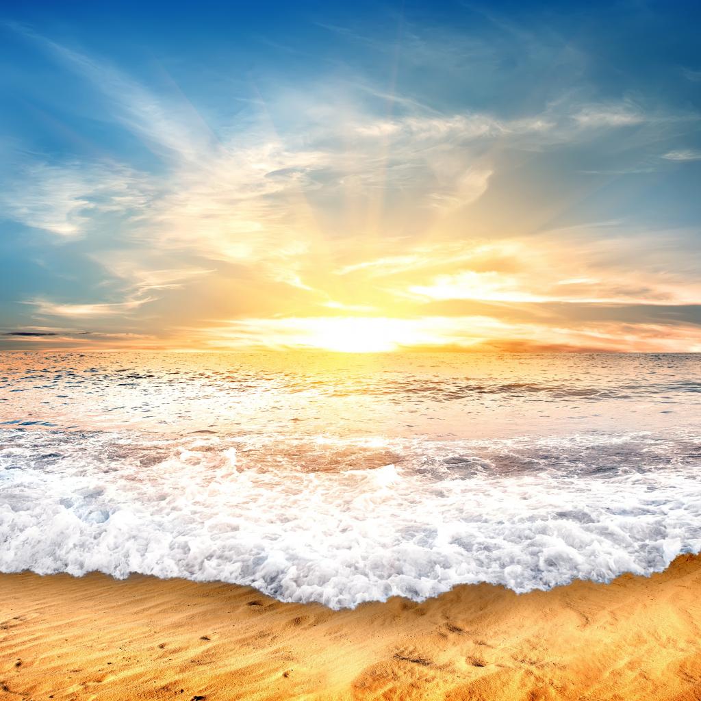 Обои Белые волны на желтом песке на закате солнца