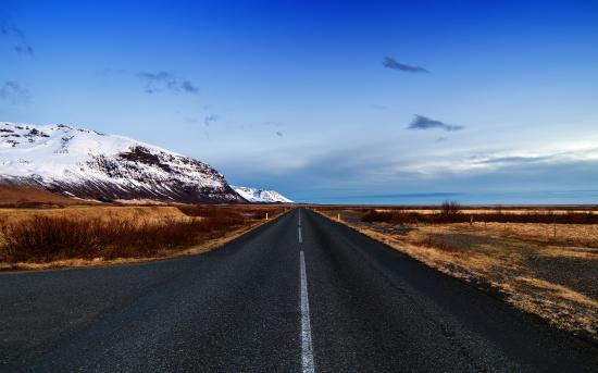 Обои Ровная асфальтовая дорога у заснеженных гор