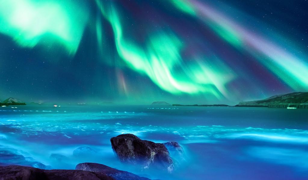 Обои Полярное сияние над заливом