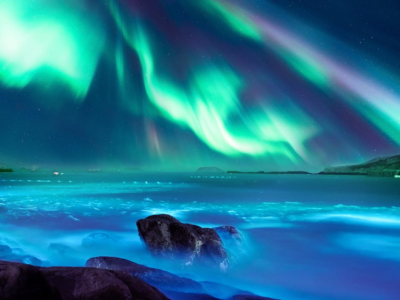 Обои Полярное сияние над заливом