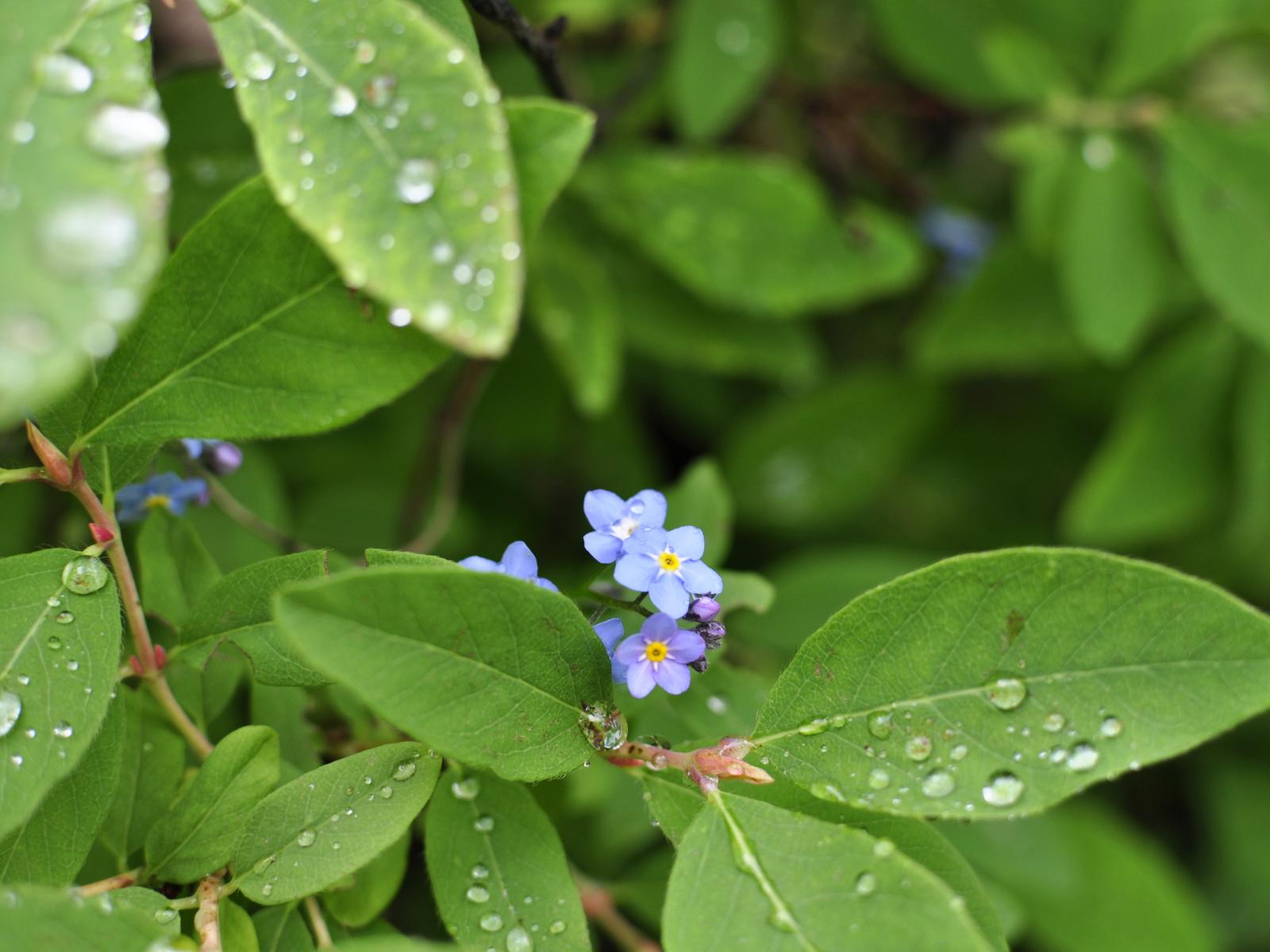 Обои Зеленые листья с маленькими цветами в каплях росы