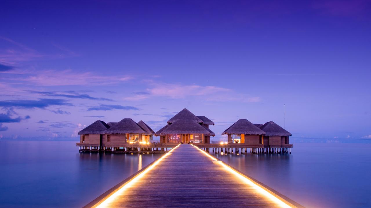 Обои Мост с подсветкой идет к домам на сваях в океане
