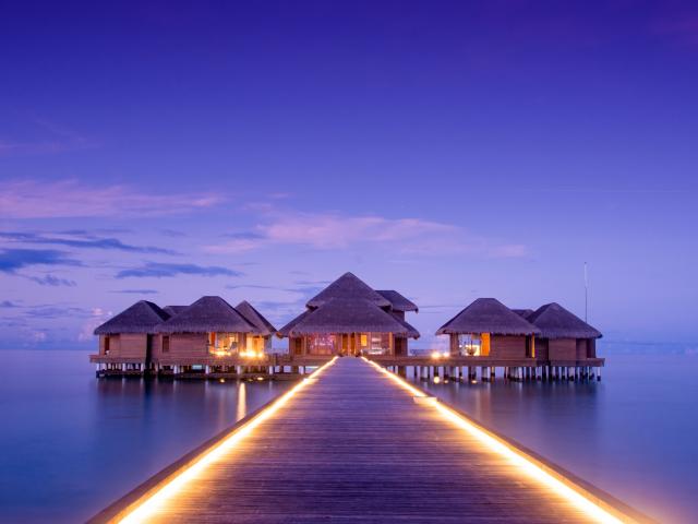 Обои Мост с подсветкой идет к домам на сваях в океане