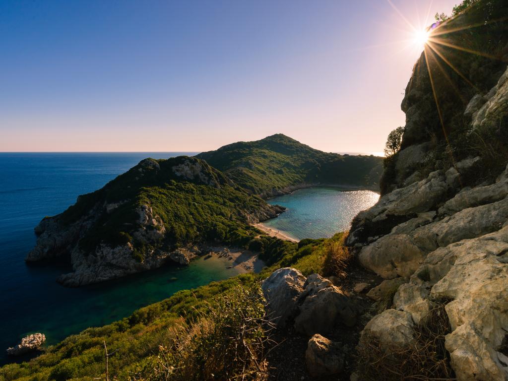 Обои Яркое солнце за скалой у тихого моря