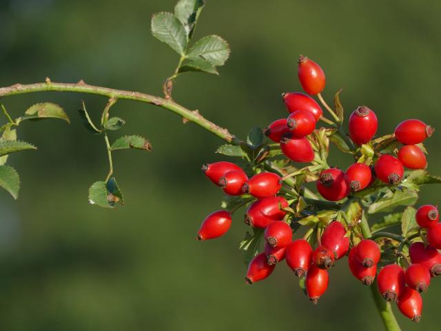 Обои Красные ягоды шиповника на ветке в лучах солнца