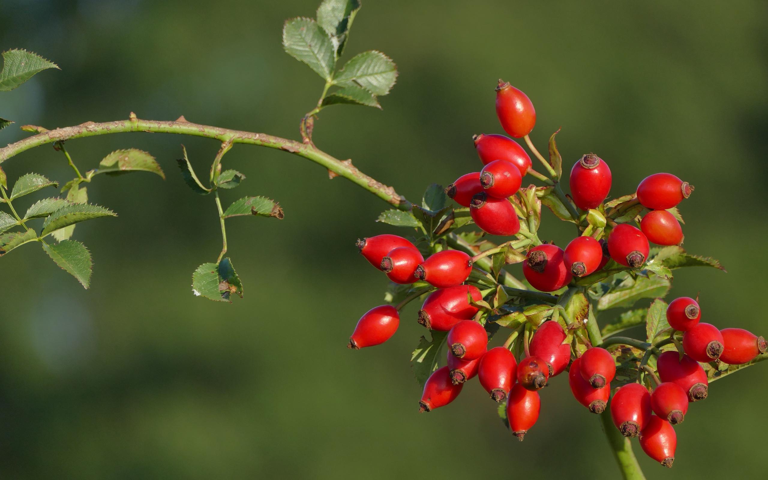 Обои Красные ягоды шиповника на ветке в лучах солнца