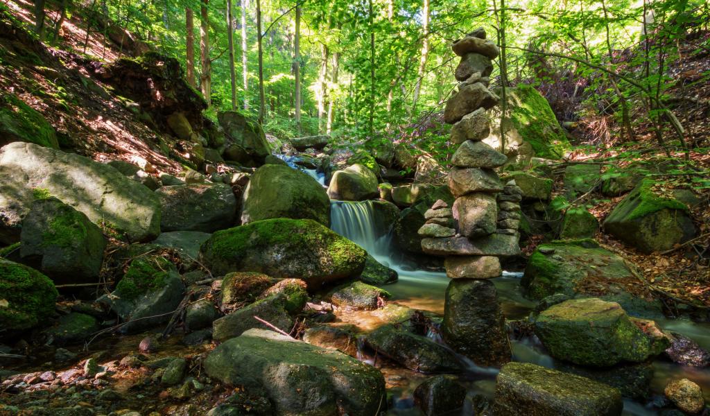 Обои Вода стекает по покрытых мхом камням