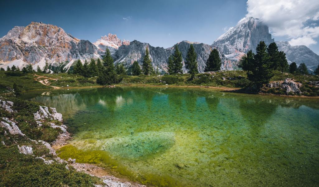 Обои Озеро у заснеженных гор под небом с белыми облаками