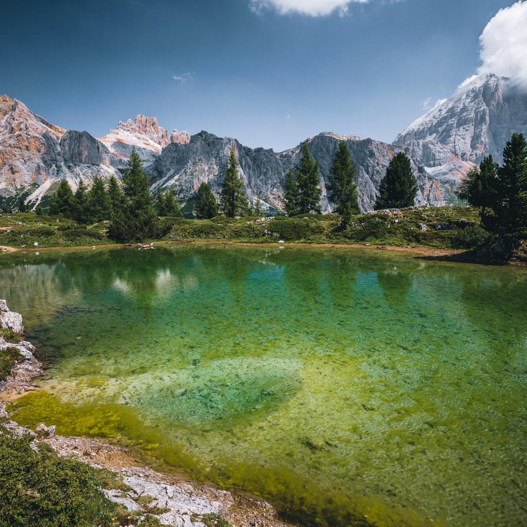 Обои Озеро у заснеженных гор под небом с белыми облаками