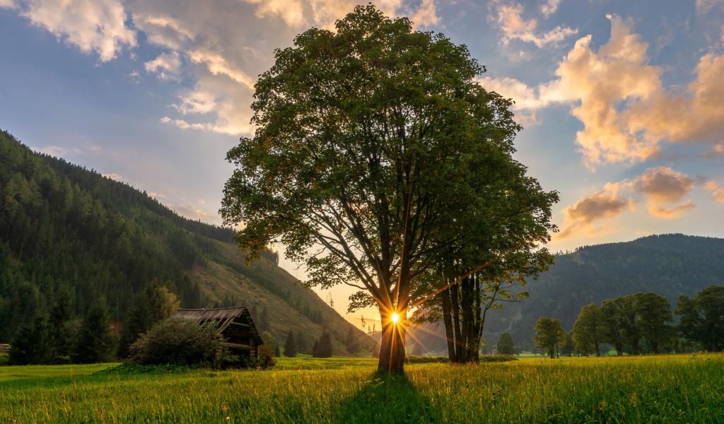 Обои Высокое дерево с зелеными листьями в лучах солнца