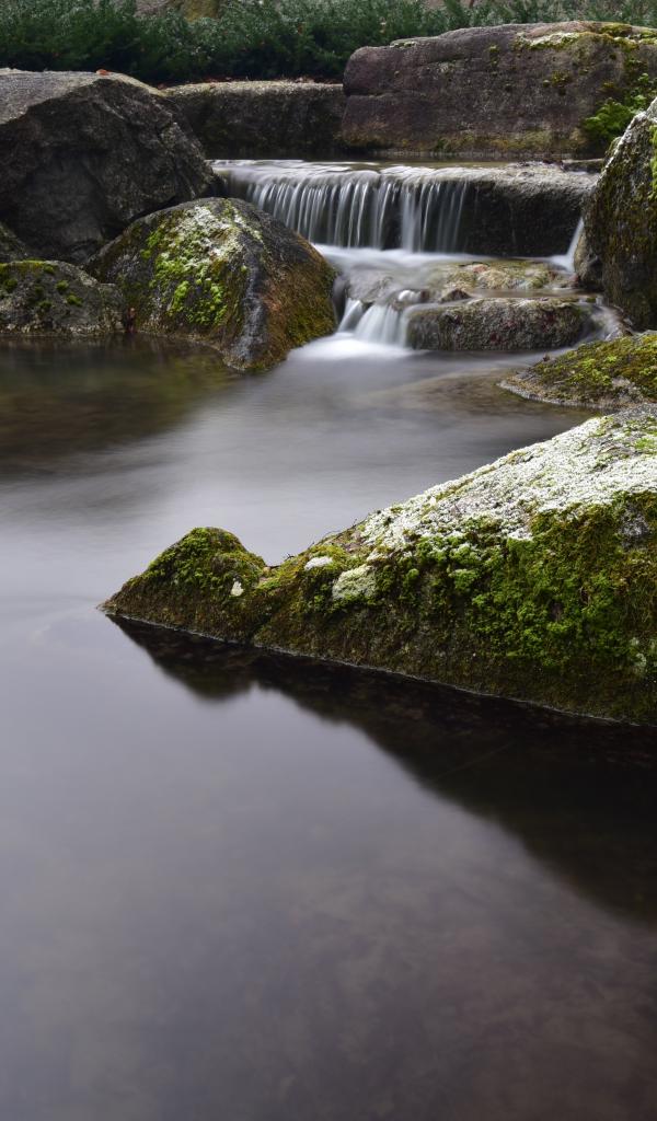 Обои Вода стекает по камням в пруд с большими покрытыми мхом камнями