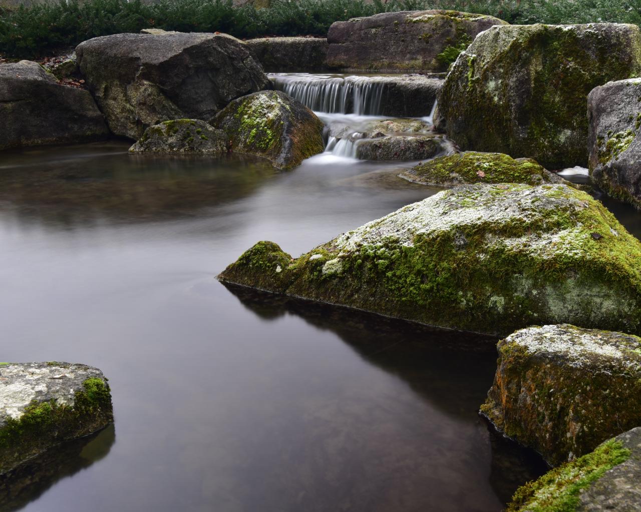 Обои Вода стекает по камням в пруд с большими покрытыми мхом камнями