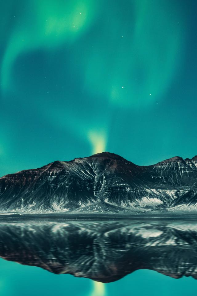 Обои Зеленое северное сияние над заснеженными горами в Исландии зимой