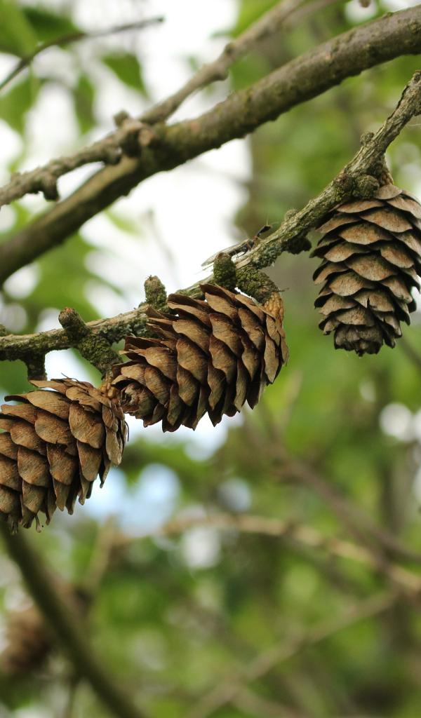 Обои Три сосновые шишки висят на ветке