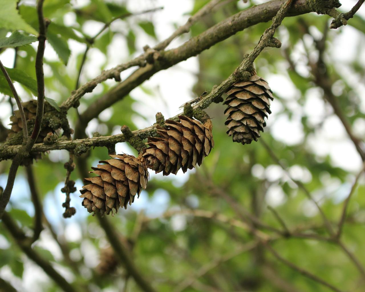 Обои Три сосновые шишки висят на ветке