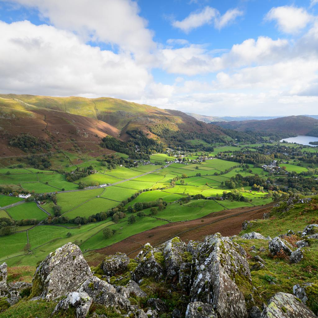 Обои Вид на зеленые холмы под голубым небом с белыми облаками летом