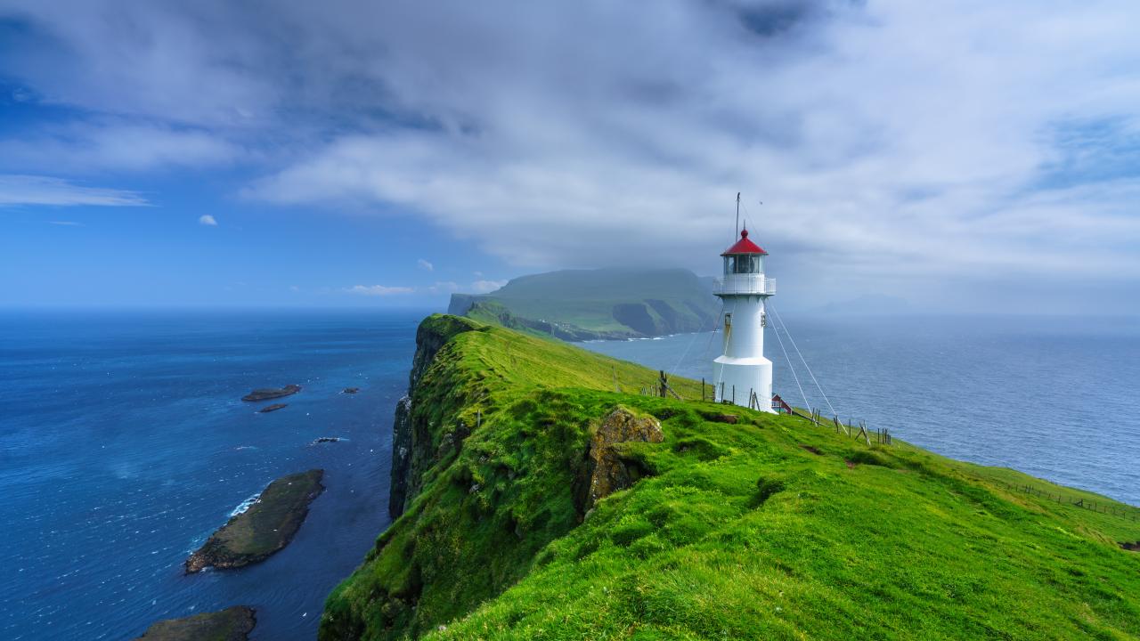 Обои Маяк на покрытой зеленью скале под голубым небом