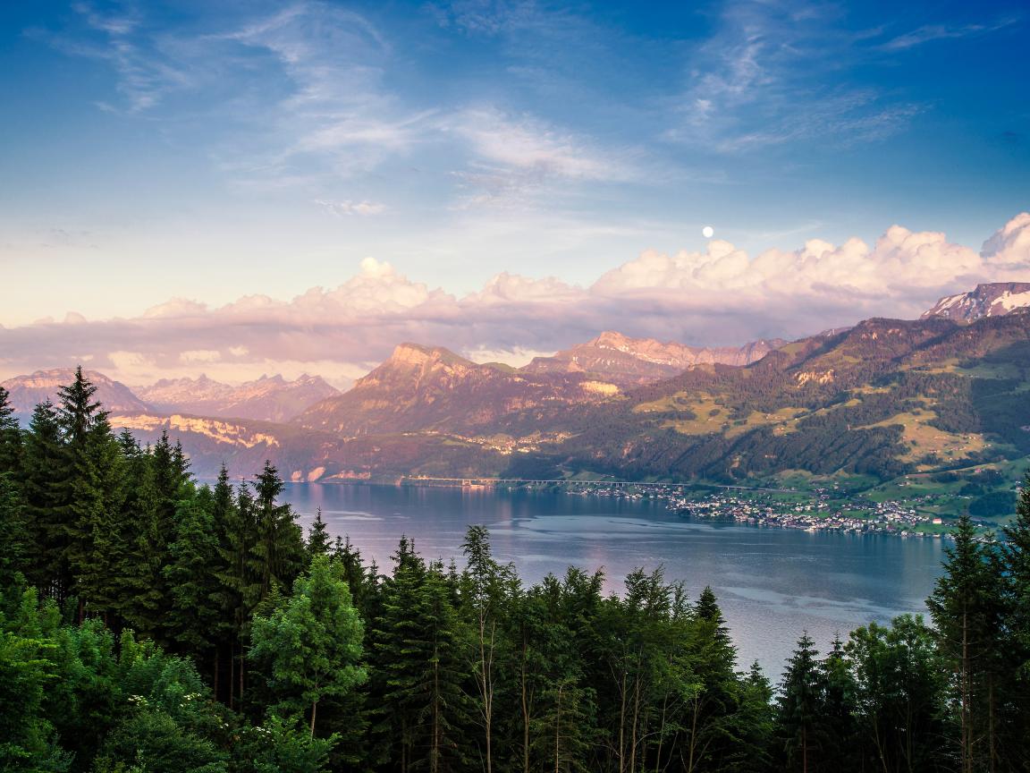 Обои Красивый вид на хвойный лес и горное озеро под голубым небом