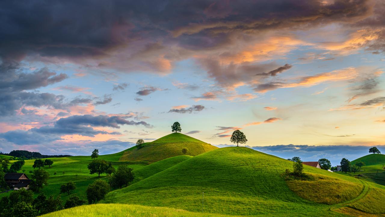 Обои Зеленые холмы с деревьями под небом с грозовыми облаками