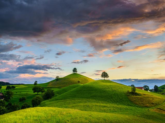 Обои Зеленые холмы с деревьями под небом с грозовыми облаками