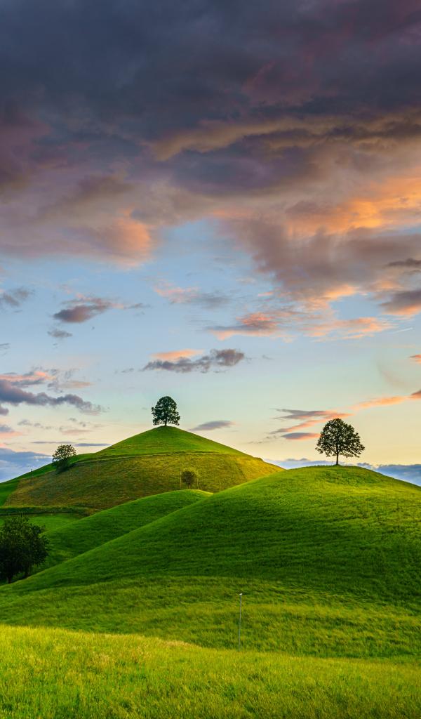 Обои Зеленые холмы с деревьями под небом с грозовыми облаками