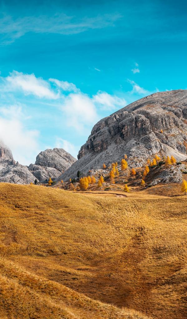 Обои Холмы с сухой травой у гор под голубым небом