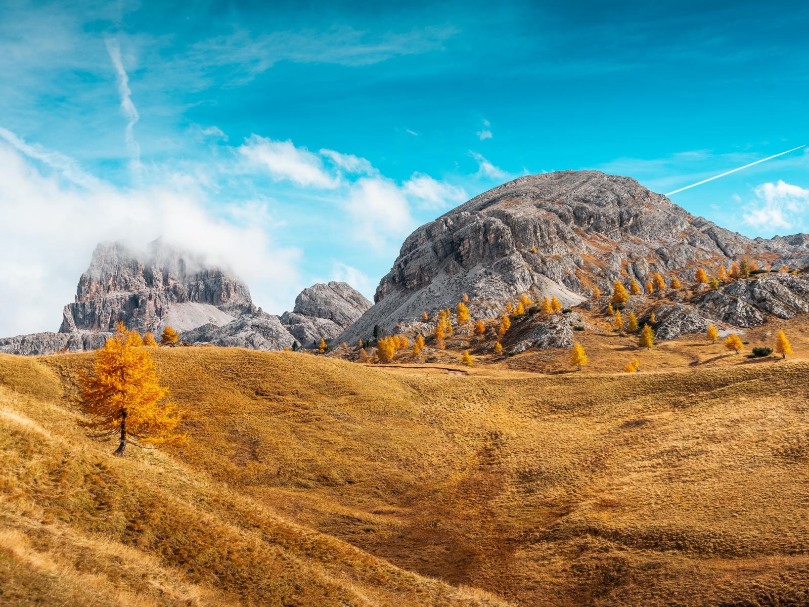 Обои Холмы с сухой травой у гор под голубым небом