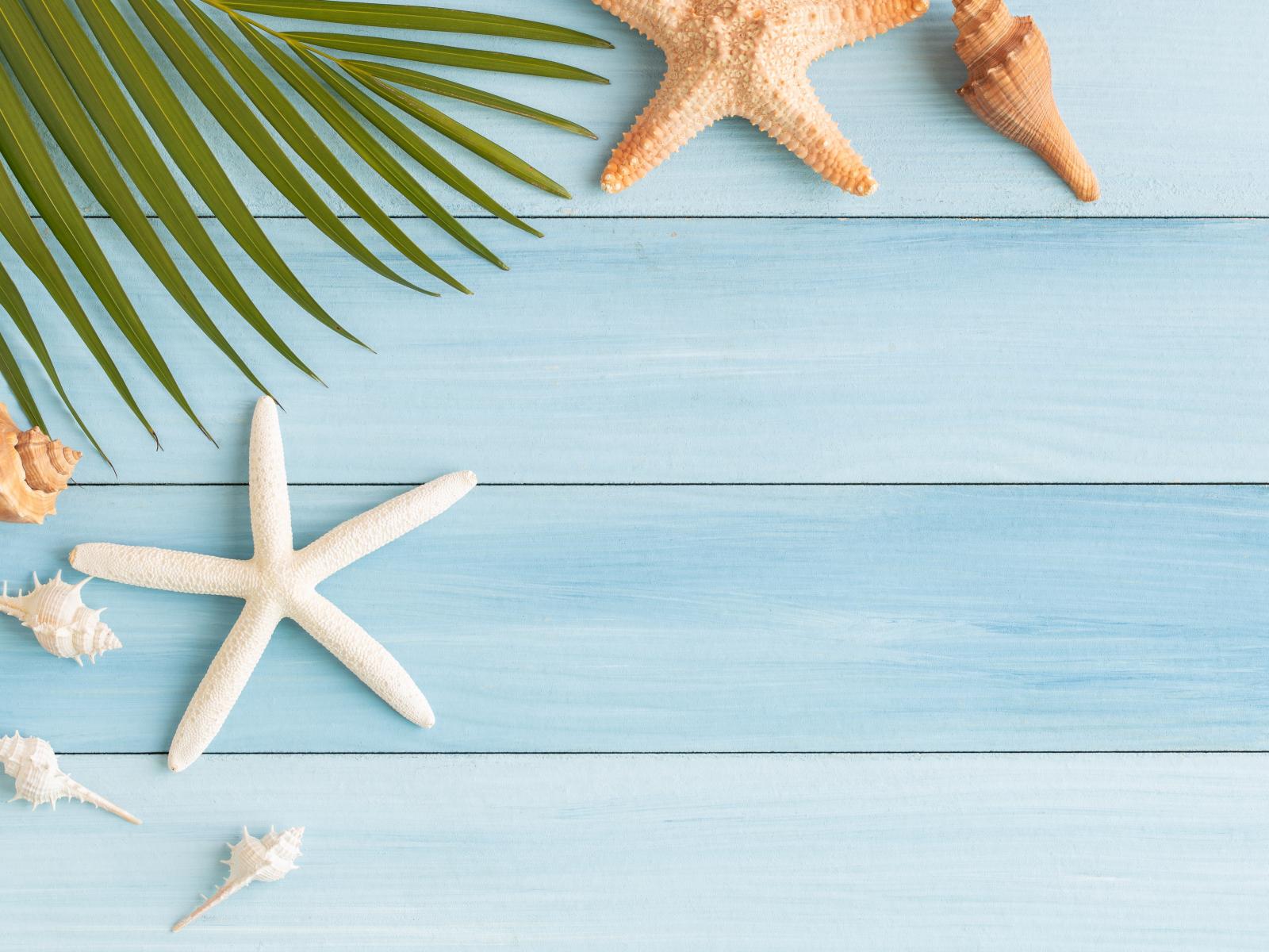 Обои Пальмовый лист на столе с ракушками и морскими звездами