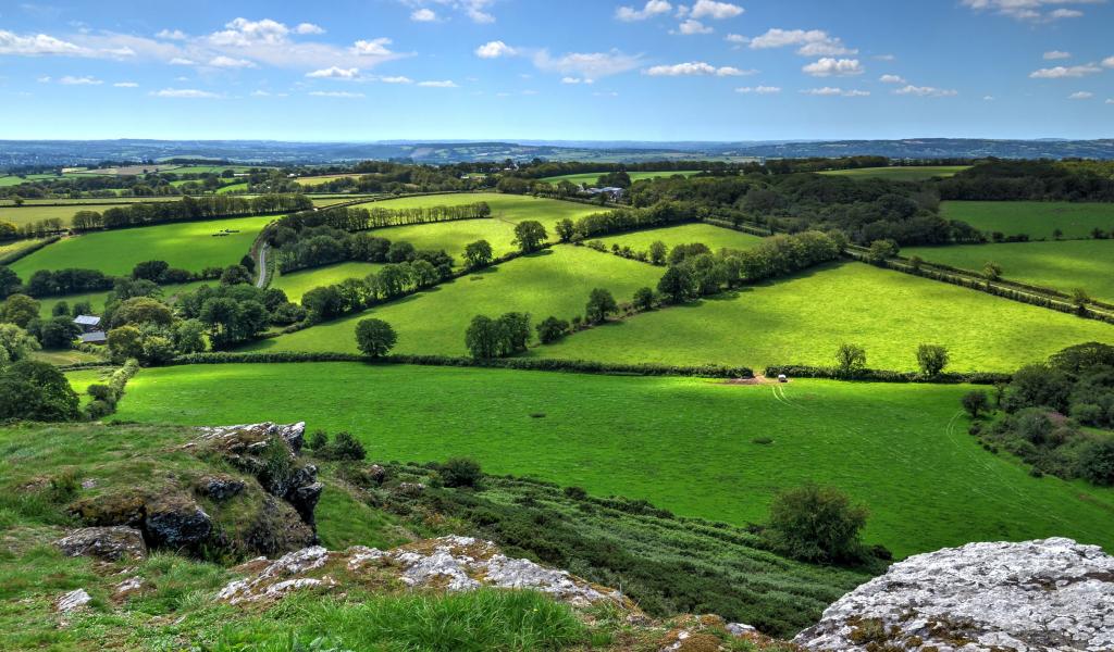 Обои Красивые зеленые луга в лучах солнца под голубым небом