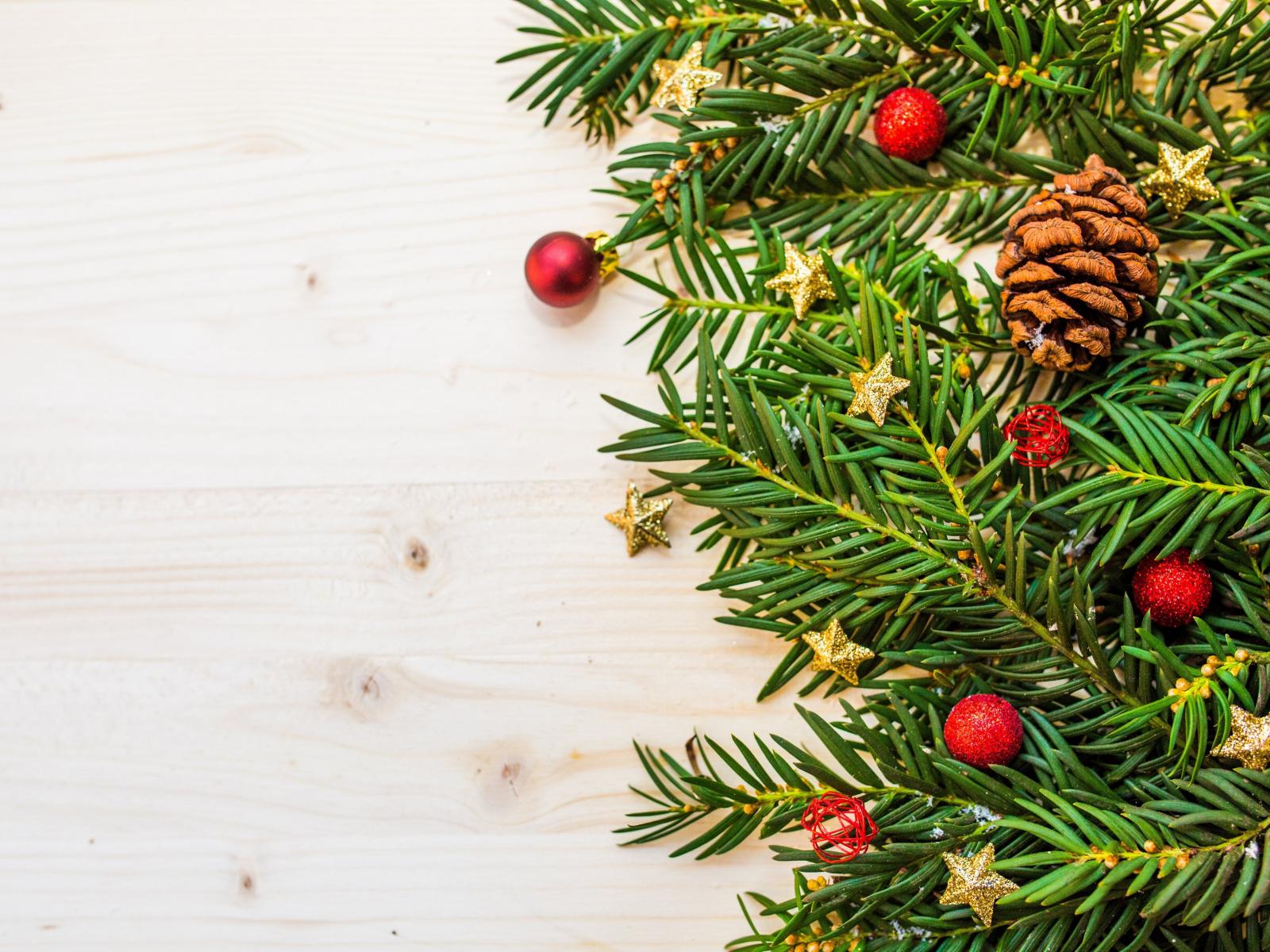 Обои Зеленые ветки ели, шишки и игрушки на белом фоне