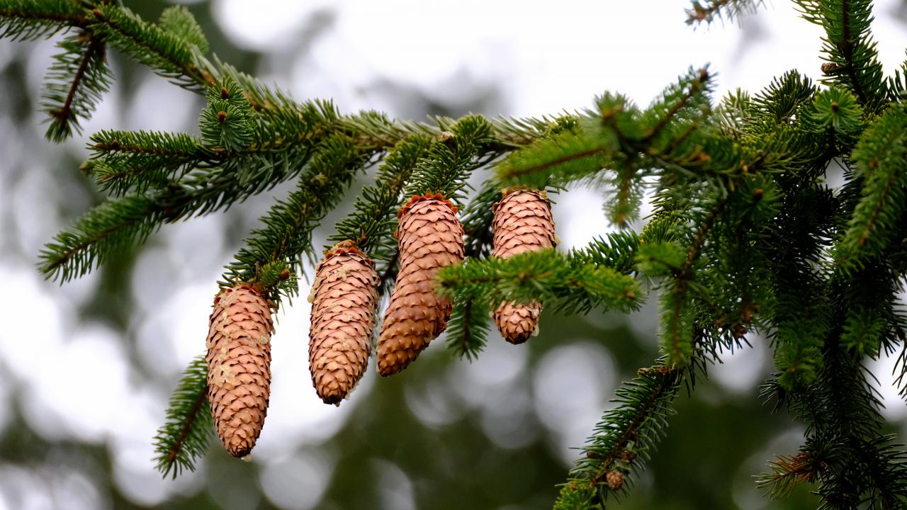 Обои Большие коричневые шишки на зеленой ветке ели