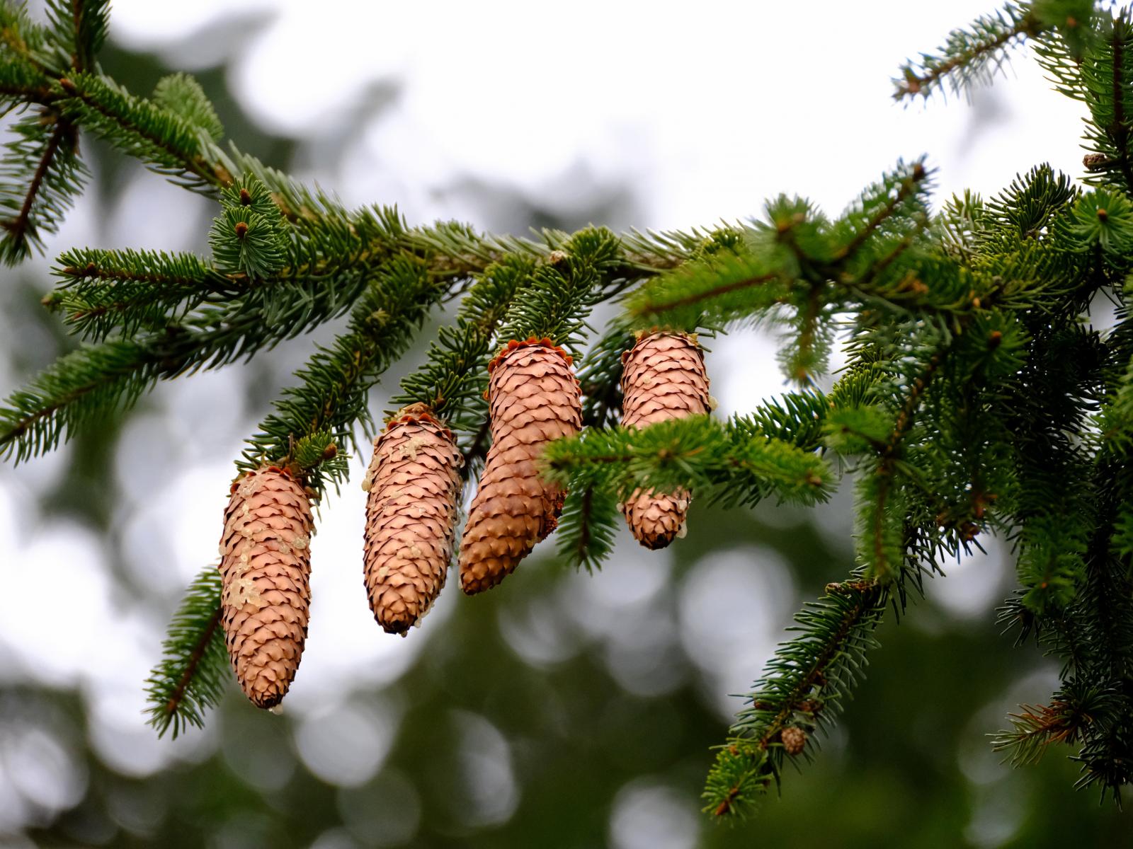 Обои Большие коричневые шишки на зеленой ветке ели