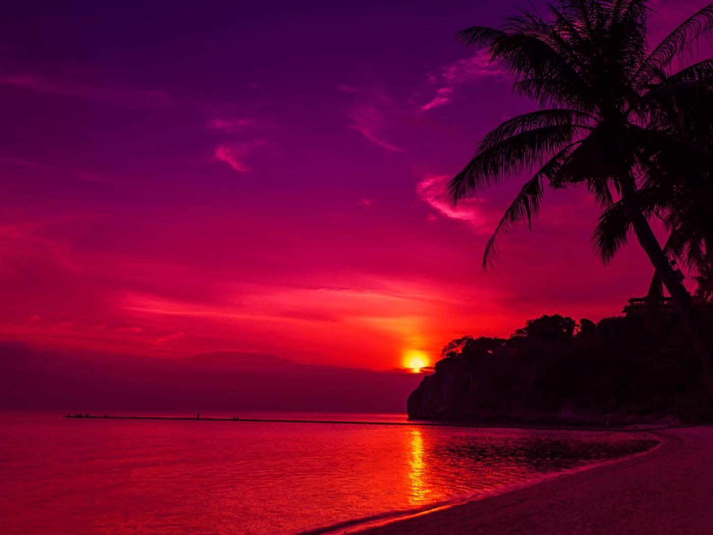 Обои Пальмы на пляже под розовым закатом