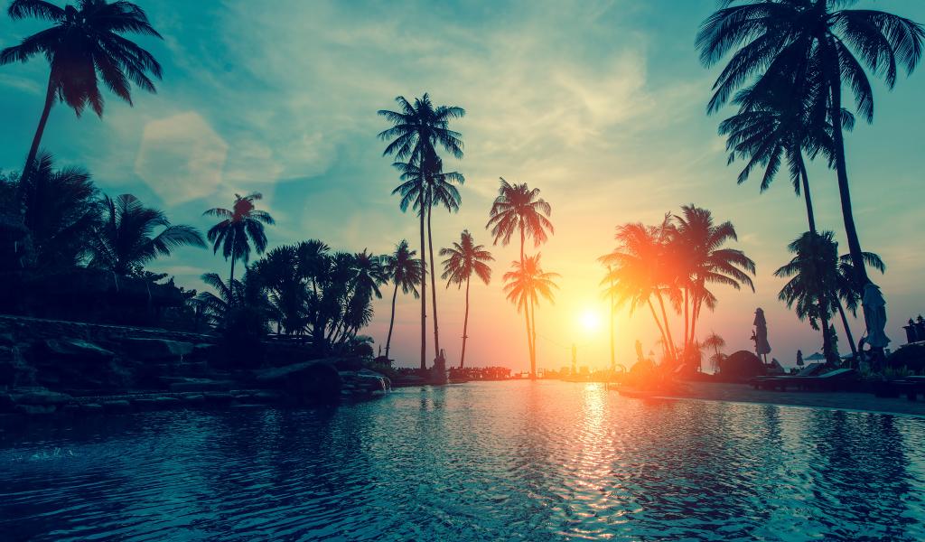 Обои Закат яркого летнего солнца над тропическим пляжем