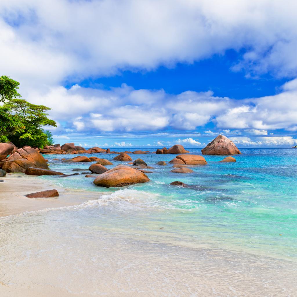 Обои Большие камни на белом песке у голубой воды океана