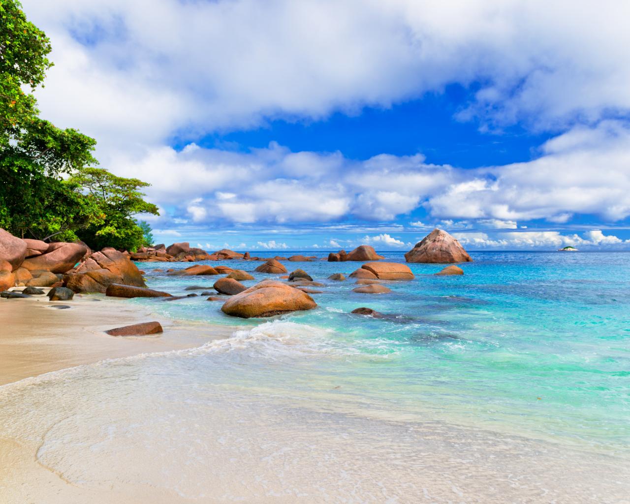 Обои Большие камни на белом песке у голубой воды океана