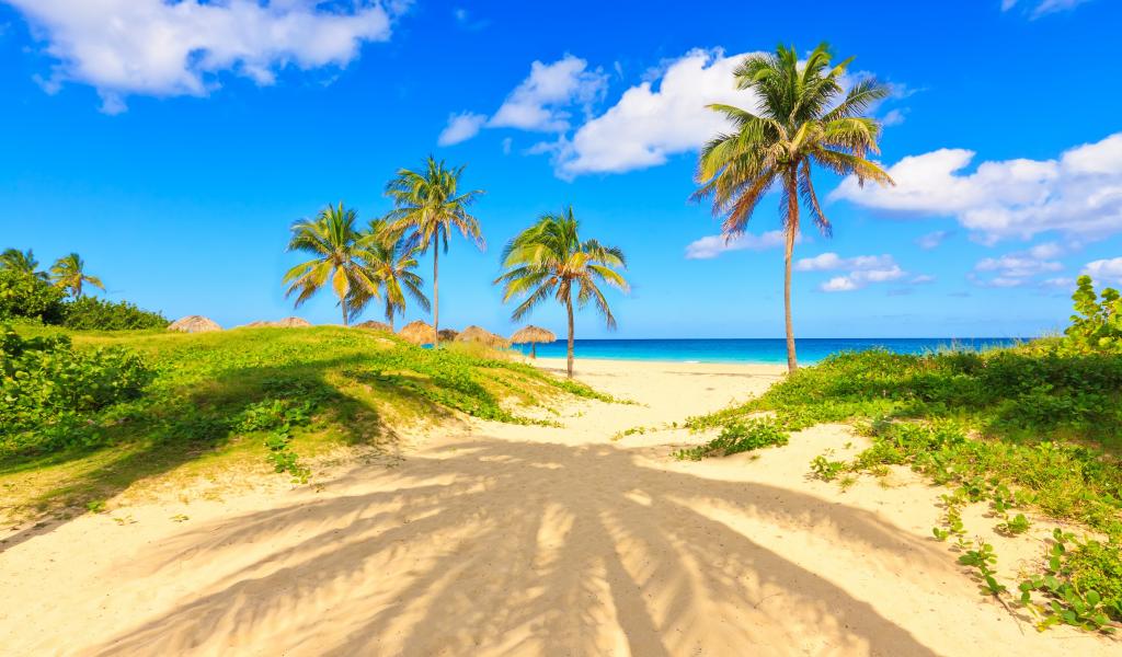 Обои Пальма отбрасывает тень на песке на тропическом пляже