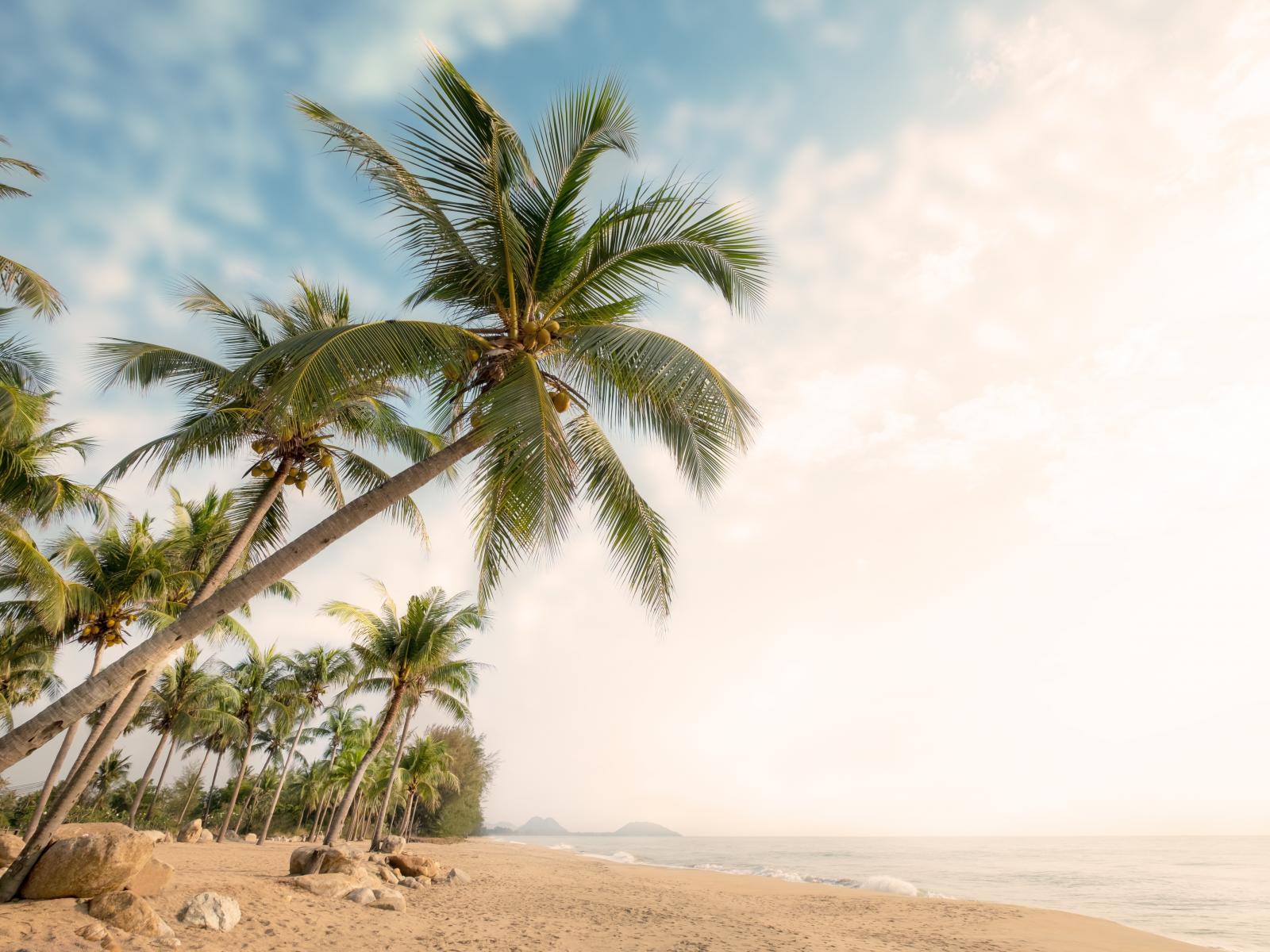 Обои Зеленые пальмы с камнями на берегу океана летом