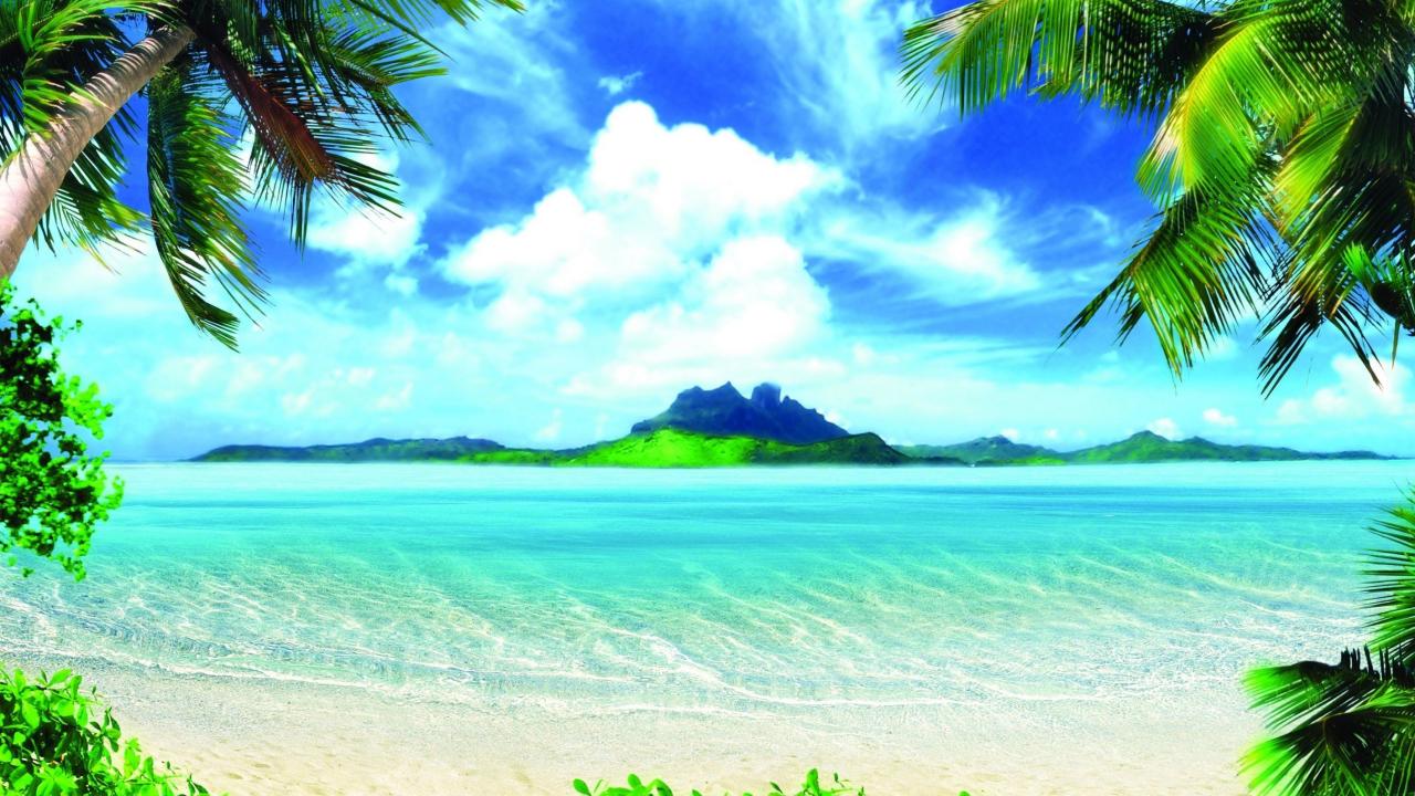 Обои Красивый тропический пляж под голубым небом с белыми облаками