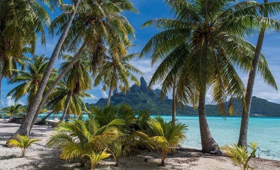 Обои Зеленые тропические пальмы над морем на пляже