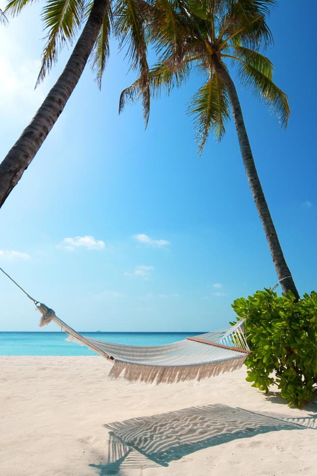 Обои Гамак между пальмами у океана на фоне голубого неба