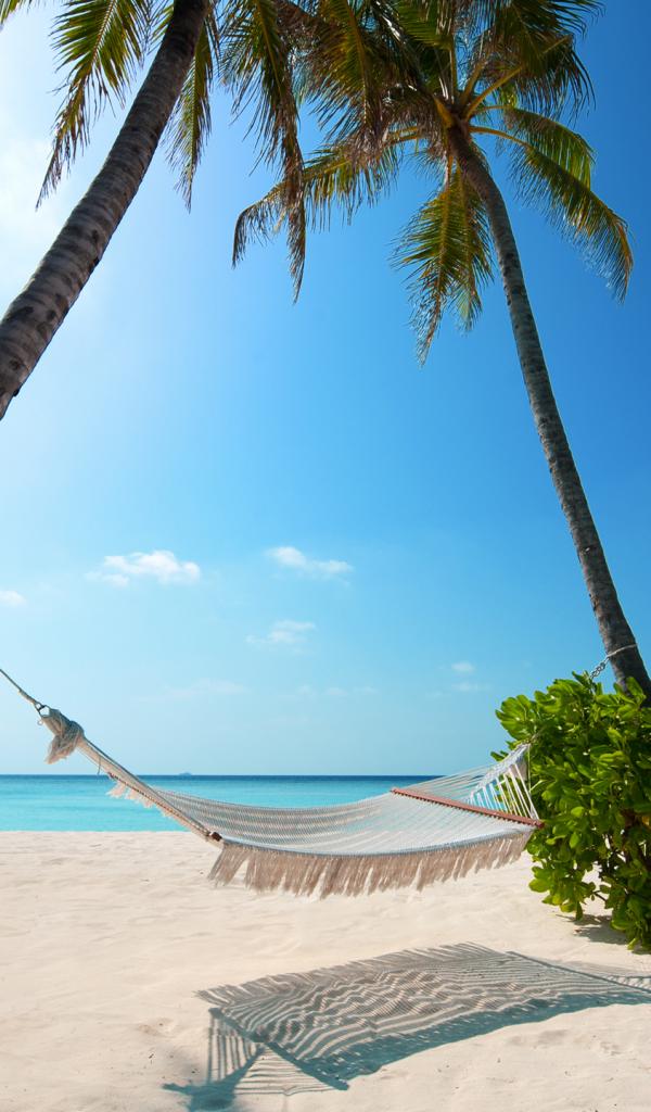 Обои Гамак между пальмами у океана на фоне голубого неба