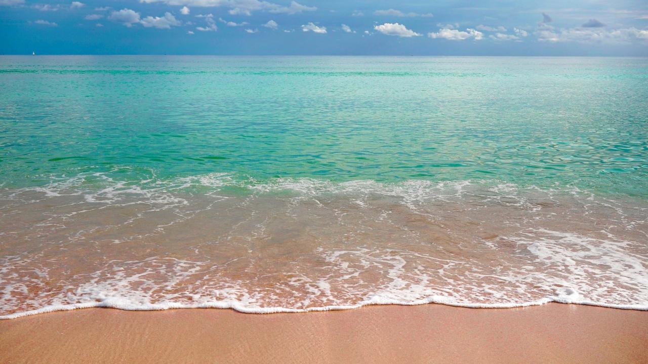 Обои Волны голубого океана на желтом песке под голубым небом