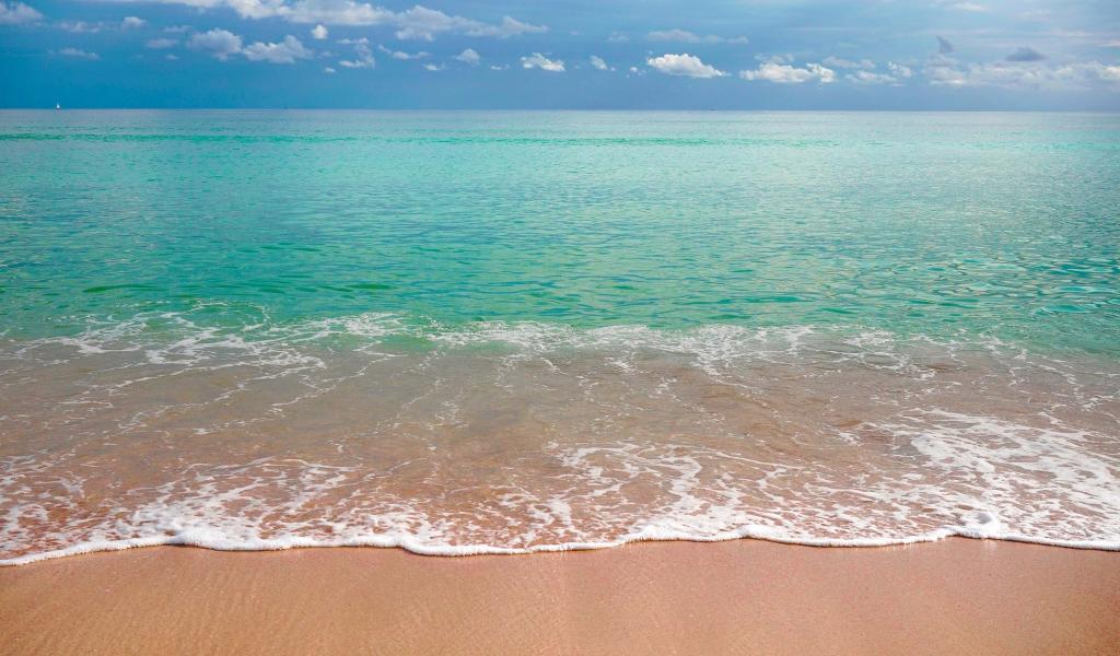 Обои Волны голубого океана на желтом песке под голубым небом